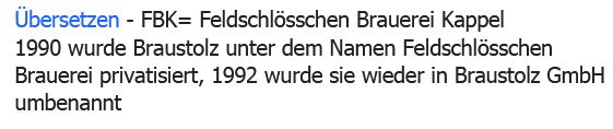 ![]() | F B K [Braustolz] Bier | Feldschlößchenbrauerei Chemnitz-Kappel, Chemnitz-Kappel, Sachsen | 23327 | |