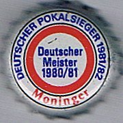![]() | Moninger [A] Deutscher Pokalsieger 1981/82 Deutscher Meister 1980/81 Bier | Brauerei Moninger GmbH, Karlsruhe, Baden-Württemberg | Bundesliga 1982 (15/21) | 22569 |