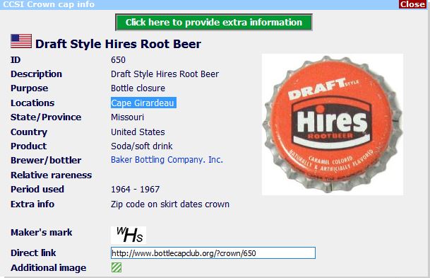 ![]() | Hires Root Beer | Baker Bottling Company Inc., Cape Girardeau, Missouri, United States | ![]() | 9621 |