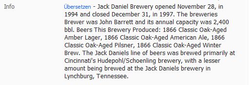 ![]() | Jack Daniel's Sonstiges alkoholisches Getränk | Jack Daniel Distillery, Lynchburg, Tennessee, Vereinigte Staaten | 11914 | |