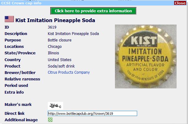 ![]() | Kist Imitation Pineapple Soda Limonade/Soft Drink | Citrus Products Company, Chicago, Illinois, United States | ![]() | 18897 |