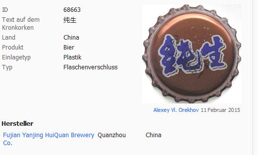 ![]() | HQB Bier | Fujian Yanjing HuiQuan Brewery Co., Quanzhou, China | Ausgegeben: 2015 oder früher | 19163 |