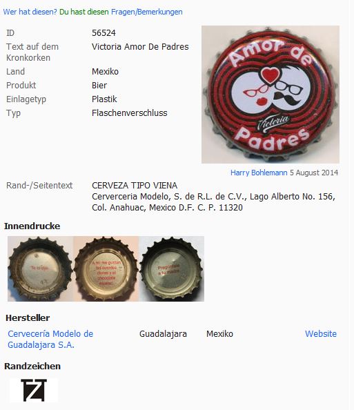 ![]() | Victoria Amor de Padres Beer | Cerveceria Modelo de Guadalajara S.A., Guadalajara, Mexiko | Inside: Ya zurci tus pantalones. | 17586 |